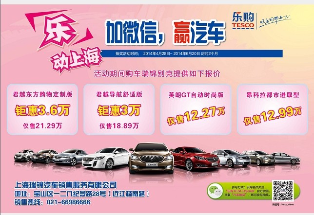 上海通用瑞锦别克与上海乐购联合举办“乐动上海”加微信赢汽车活动。